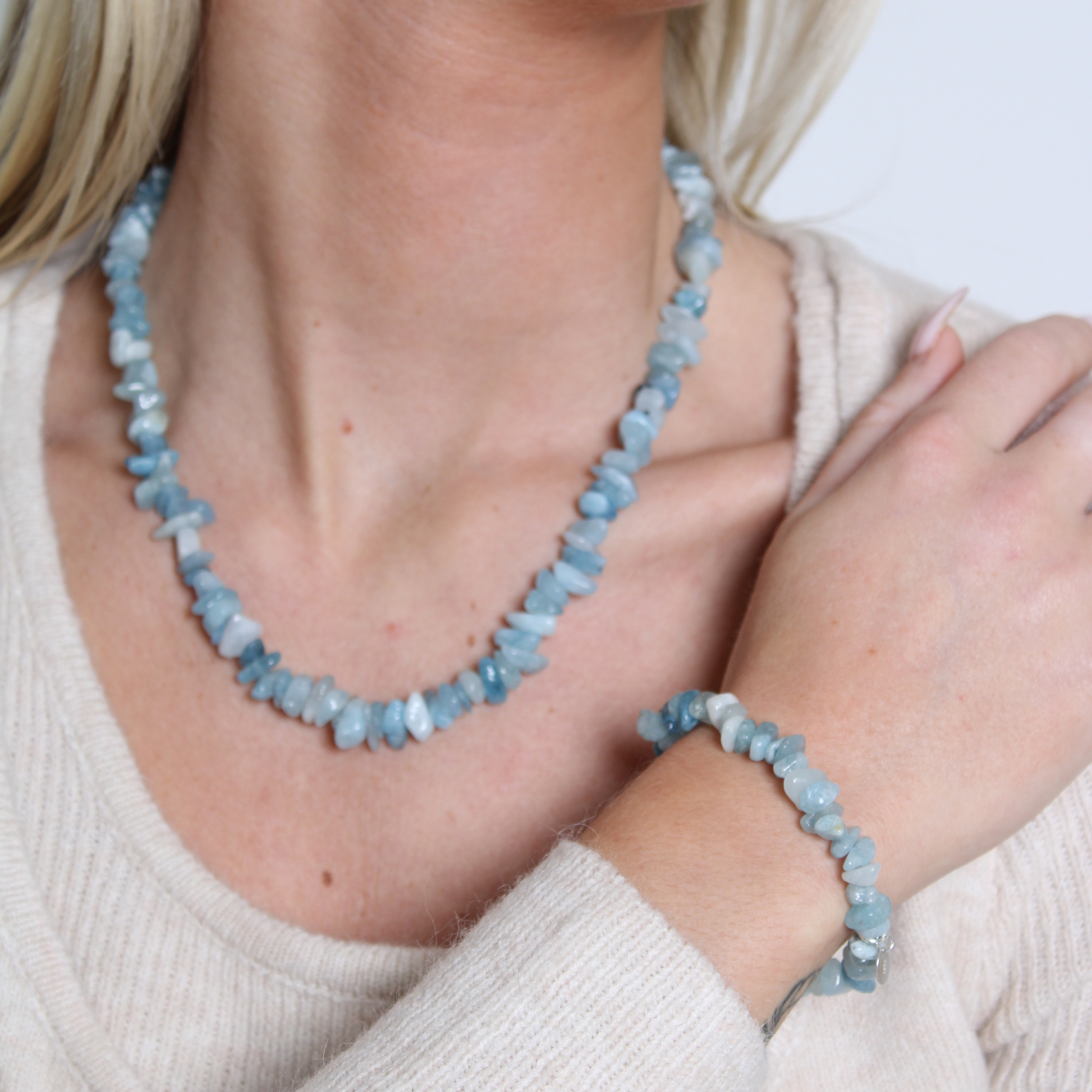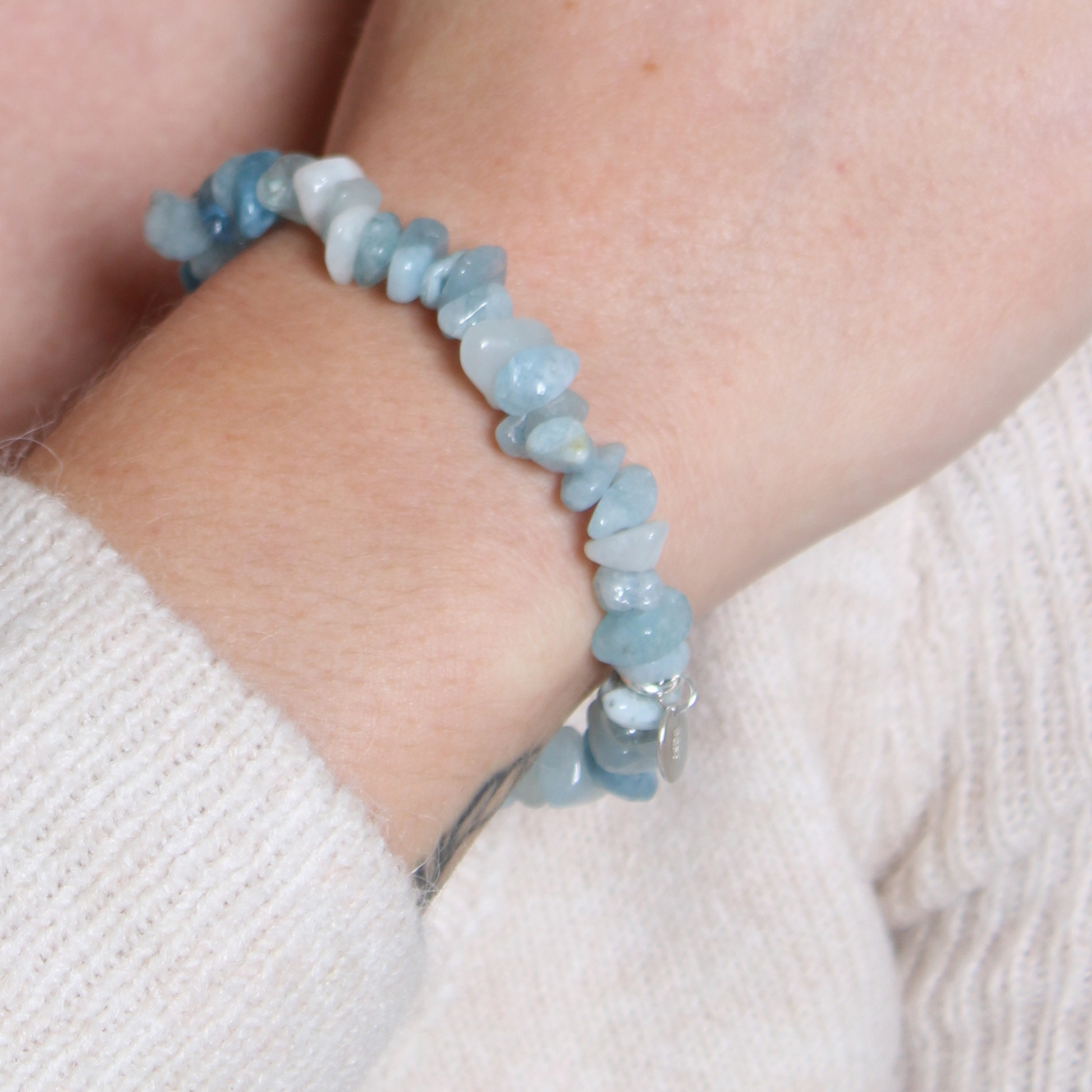 Crafted from natural, highest-quality Aquamarine chips, each waterproof bracelet is unique in shade and pattern. Aquamarine is treasured for calming energy and truth.