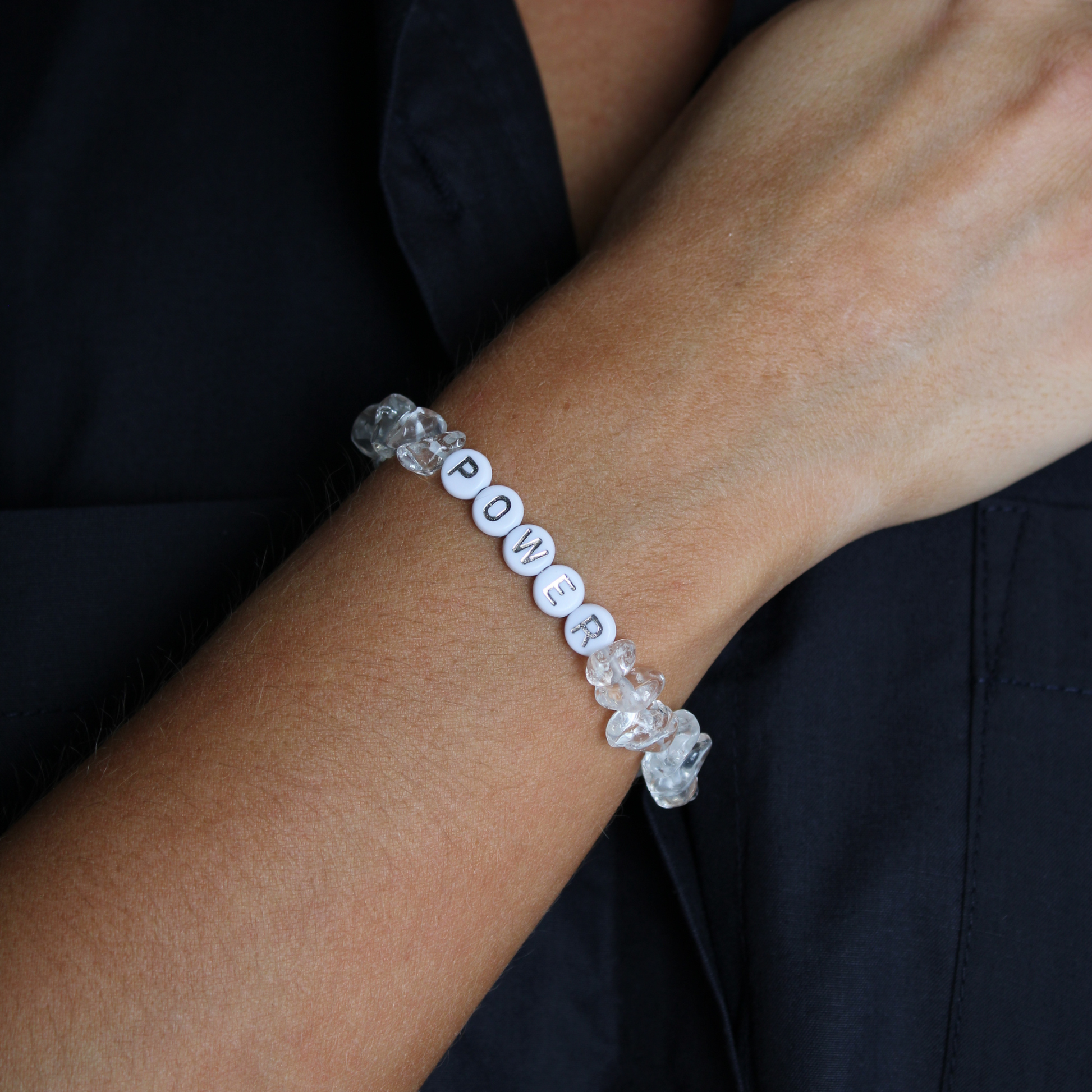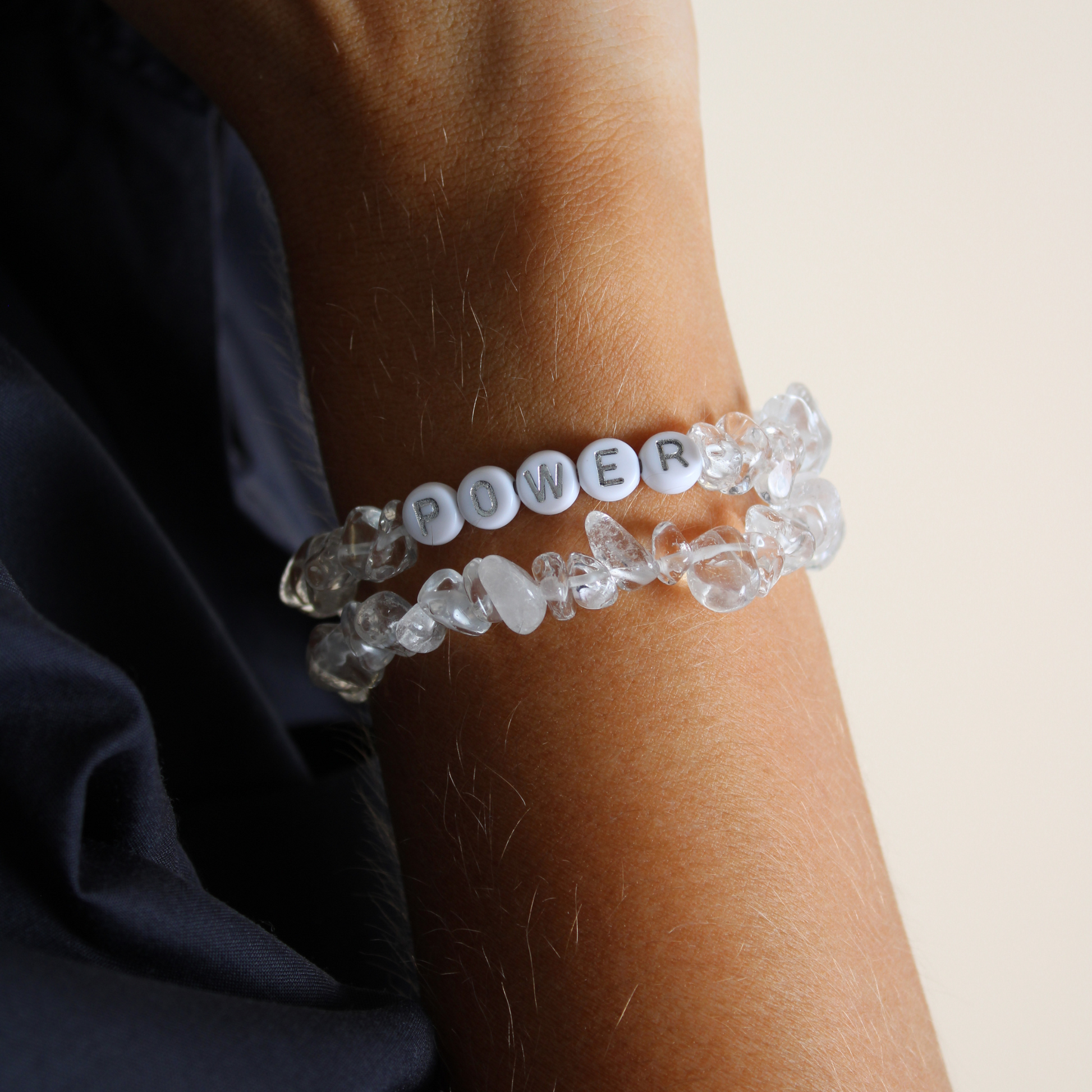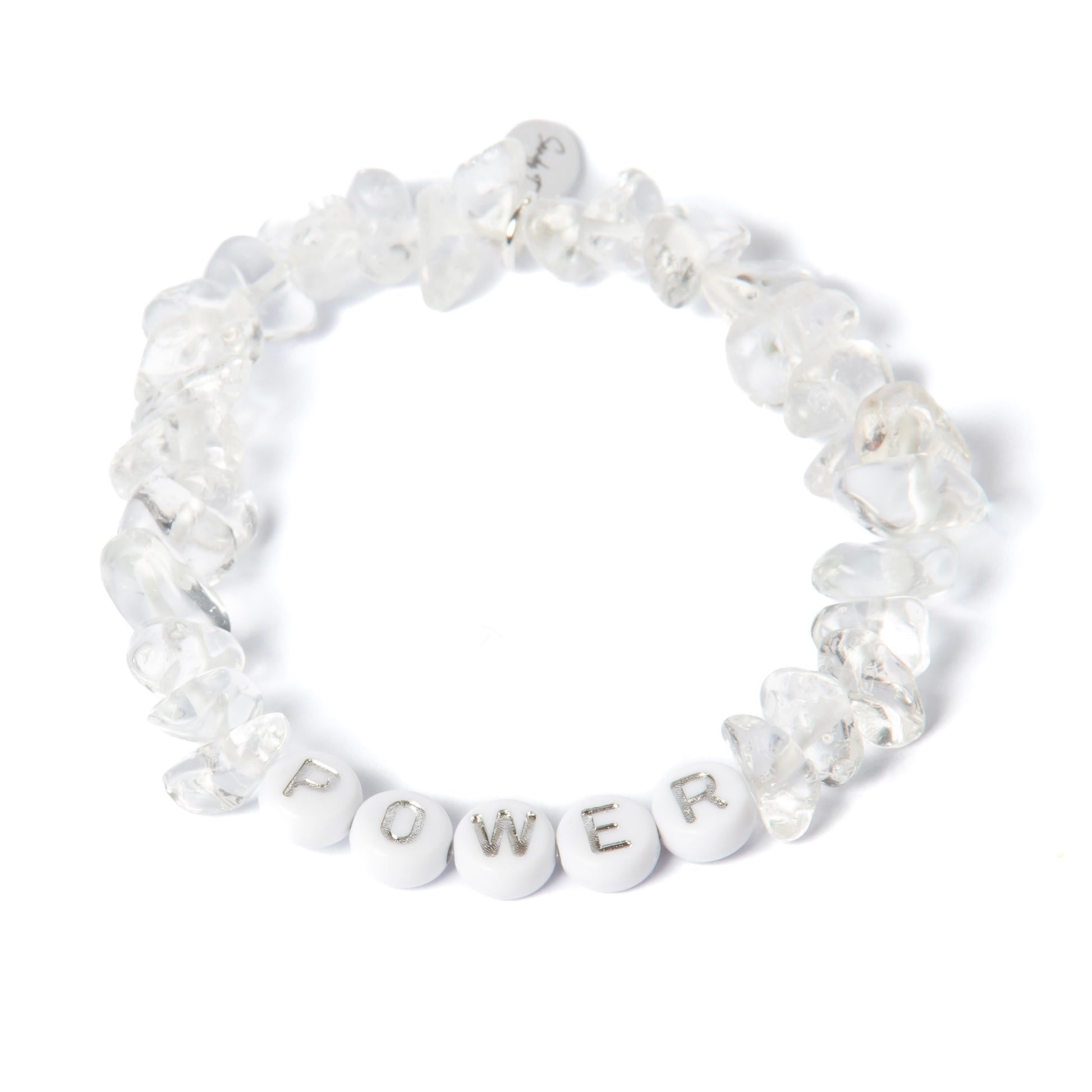 When you need strength, Clear Quartz delivers. The enamel bead spells out POWER, magnifying your intention.