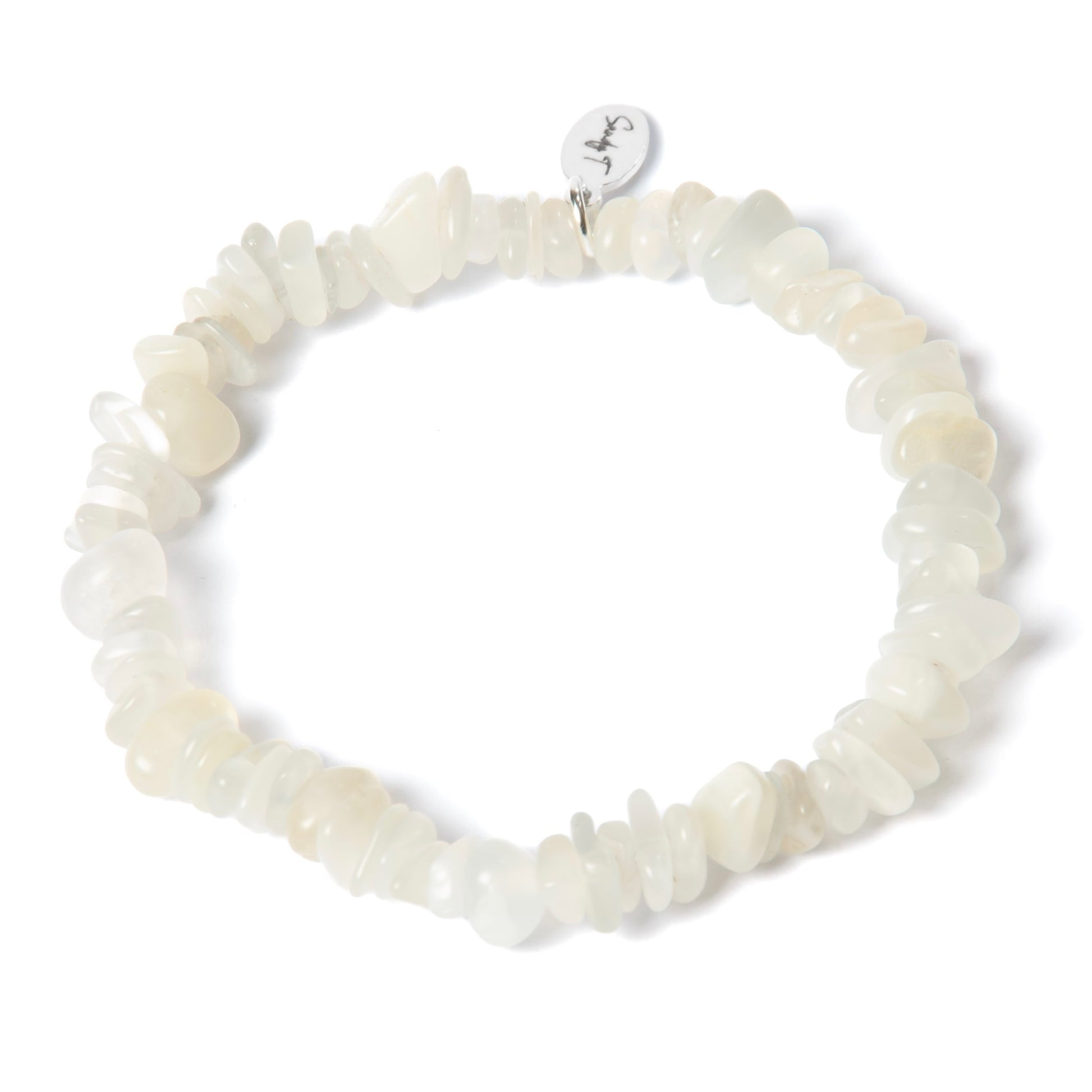 Made with natural, highest-quality Moonstone chips, each waterproof bracelet is uniquely yours. Moonstone is known for its calming energy and feminine strength.