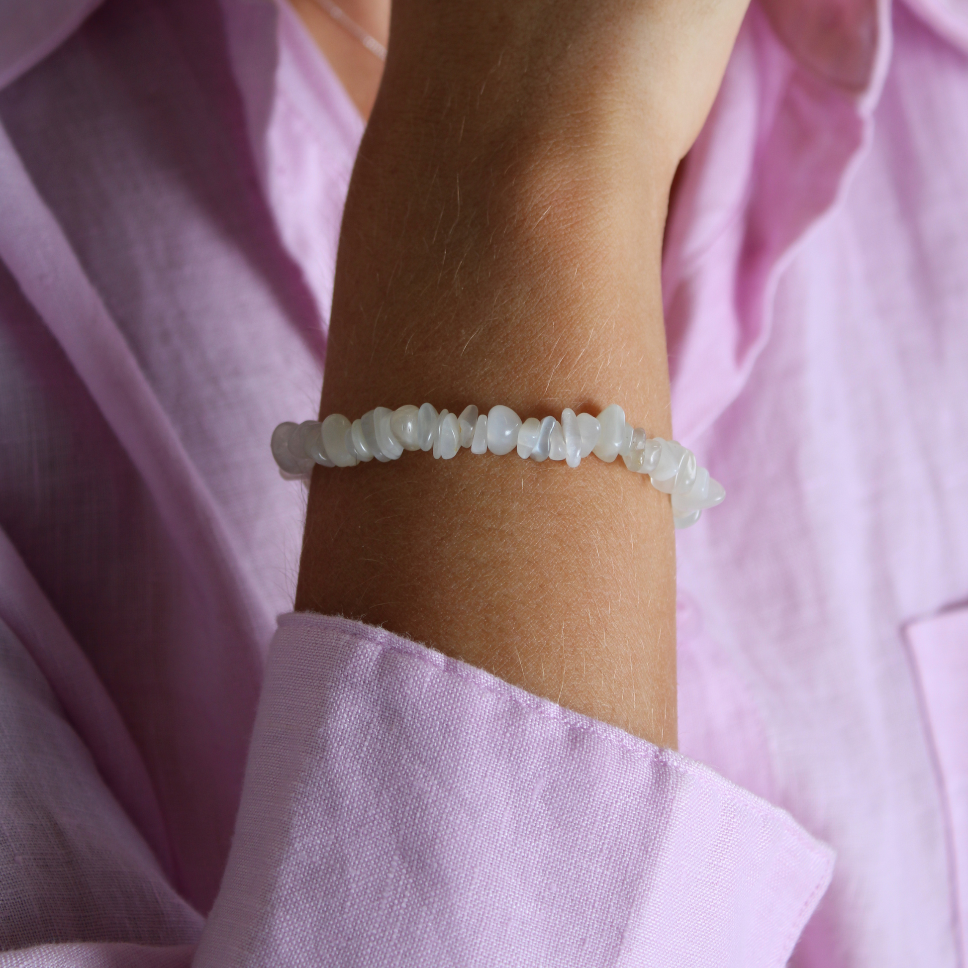 When emotions shift, Moonstone restores balance. This chipstone bracelet reflects new beginnings and intuition.