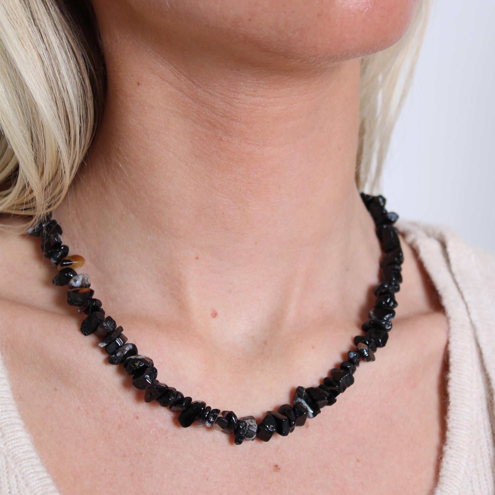 When negativity surrounds you, Onyx protects. This necklace combines natural Onyx chipstones with a sterling silver clasp for bold elegance.