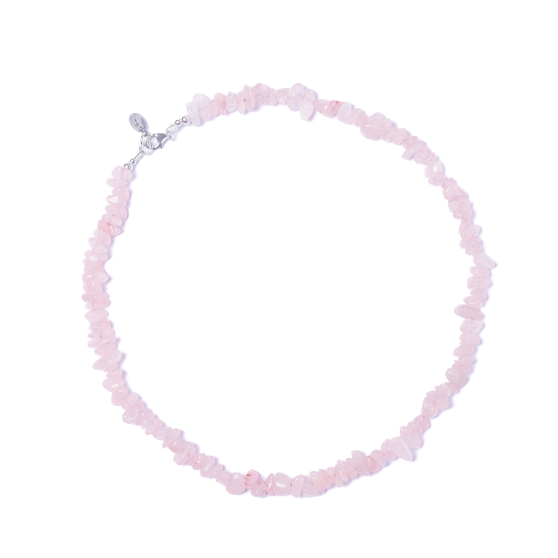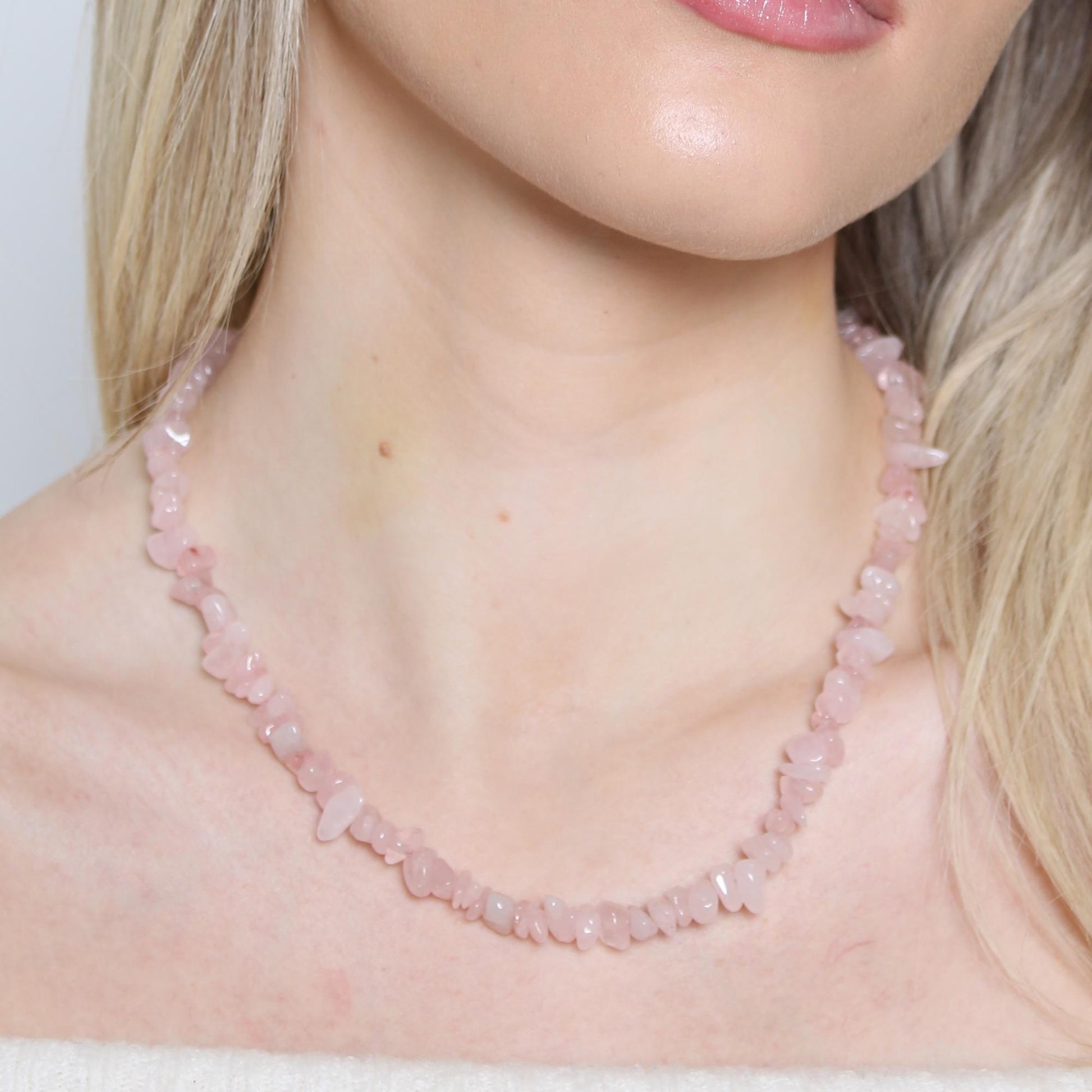 When love is needed, Rose Quartz opens the heart. This necklace features natural Rose Quartz chipstones with a sterling silver clasp.